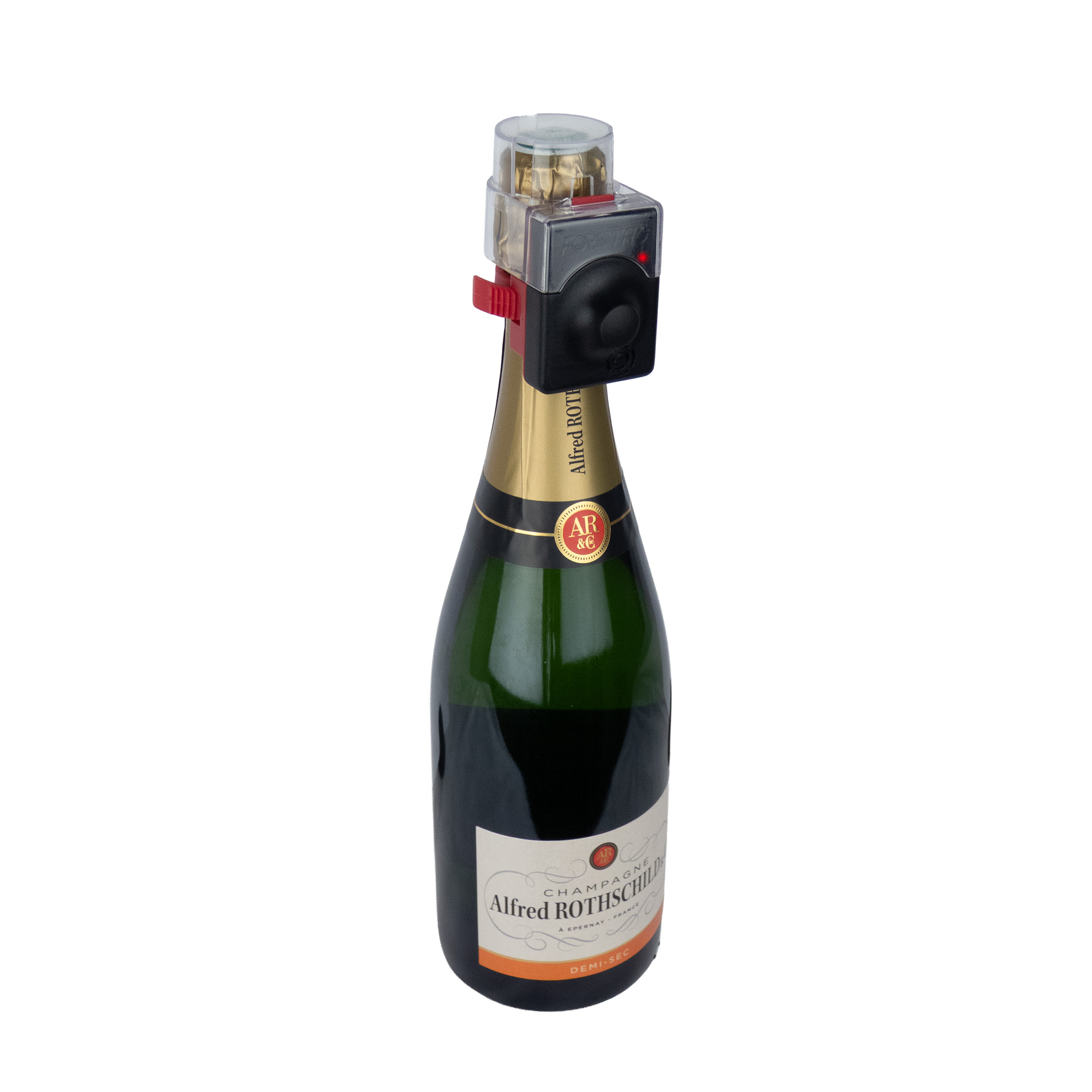 Déclenchement de l’alarme intégrée au tag antivol lors du retrait de la bouteille sans déverrouillage.