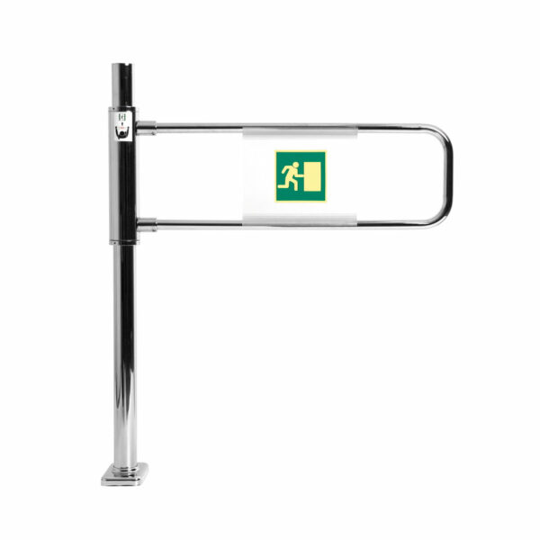 Portillon mécanique pour issue de secours muni d’un crantage autorisant le passage en cas d’urgence.