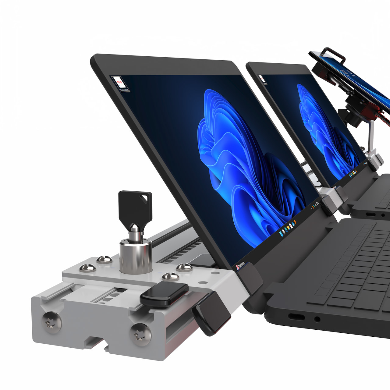 Adaptable à diverses configurations (ex. : 2×15″, 1×14″ + 1×17″, 2×14″), ce rail anti-vol est compatible avec tous types l’ensemble des ordinateurs portables et tablettes disponibles sur le marché. Installation facile, vis inaccessibles et montage modulable selon besoin.